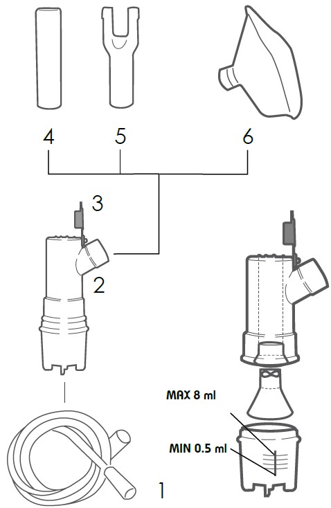 4. Zet op het verstuiverflesje het gewenste hulpstuk (mondstuk (4), neusvork (5) of maskertje(6)) zoals aangeduid is in de schets w.b. de aansluiting van de