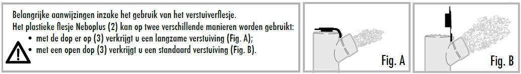 de tabellen op bladzijde 16. Het buitenkomen van de verstuiving van het flesje bevestigt de juiste werking. Als het toestel nieuw is, is het normaal dat de