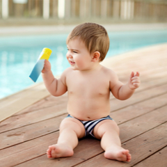Baby's en kleine kinderen blijven het best altijd uit de zon. Als je met je baby toch buitenkomt smeer dan een factor 50+, zorg voor een parasol op de kinderwagen en laat hem/haar altijd een petje of hoedje dragen en een goede zonnebril. Vermijd buiten komen zeker tussen 10 u 's morgens en 16 u 's middags. Zorg dat je baby voldoende drinkt en smeer voldoende zonnebrandcreme elk uur en zeker na elk zwembadmoment. Het gebruik van een aftersun wordt aanbevolen.